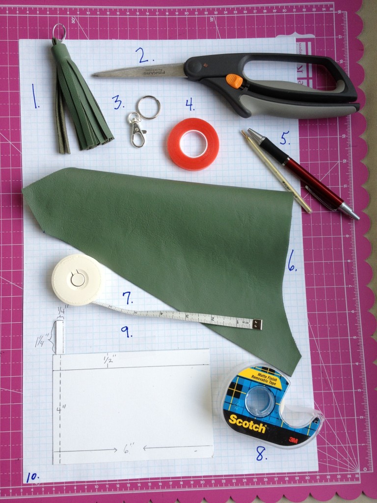 My leather came from the remnant bin at Tandy Leather. Craft stores generally carry small pieces of leather or you can recycle some from your closet. Hobby stores and fabric stores will carry the double sided tape (I used 1/4″, though any up to 1/2″ will work). Those same stores will carry the key rings and swivel hooks in several finishes. If you are still reading, let’s get started!