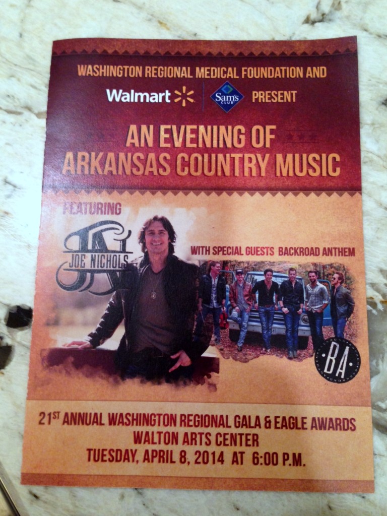 Well, if you have been reading this blog since we retired, you know that life consists of concerts and more concerts! We live about a block from the Walton Arts Center, Randy can get student tickets and we go every chance we can. The latest show was actually a fund raiser for the local hospital foundation. I went as a +1 date with my sister. We ate, we drank and we listened to Backroad Anthem and Joe Nichols play some great music. It was a lovely evening!