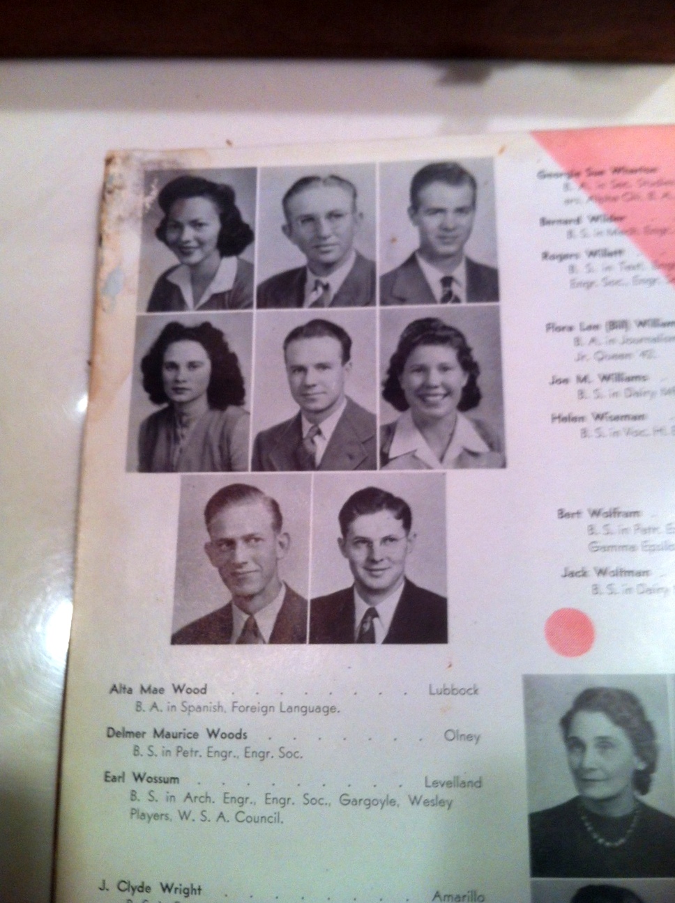 Well, you know we are moving. Might as well send me to the funny farm now! Not only are we moving, we don’t know where we will be until our house is finished. Patrick came home to give us a hand at packing. Certainly enjoyed his visit. The first thing he and I tackled was my dad’s stuff. Yep, it is still exactly where he put it when he moved in! The sad news is that he has been gone for 2 years and I hadn’t touched a thing. So, Patrick and I went through and packed what we are keeping. We did find some Texas Tech yearbooks and one OU yearbook from the past. I just had to crack them open and, lo and behold, found pictures of both my mom and dad and my aunt! Here, take a look: