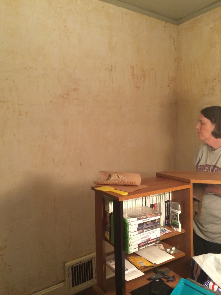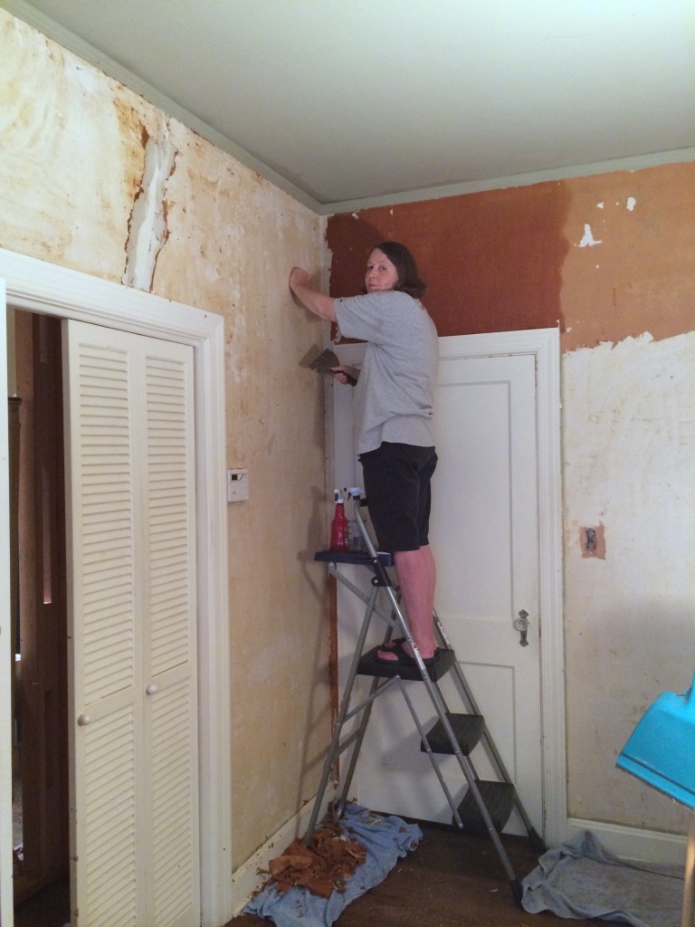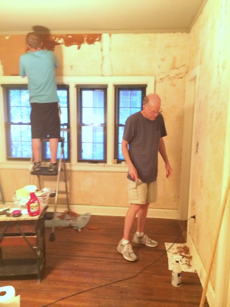 Patrick wanted to know if this wallpaper was EVER in style.  After I broke the news that yes, people liked it once upon a time, I offered to remove it!  Can we just say “Cathy is so STUPID” but nice!  I scheduled two days to get it down and in shape for paint.  HA HA HA.  I started on the north wall and managed to get one strip off the wall.  LO and Behold, there was another paper under this one.  The only thing I can say is the design of wallpaper in the 60’s was better than the one in the 80’s.  As I proceeded to remove a navy blue plaid from the same area, I hit an orange painted wall.  Success!  Or so I thought.  The paint was coming off in sheets because….it was painted over yet another wallpaper.  After removing the paint and 80 year old glue, we hit plaster!  Woohoo.  There was even some carpenter’s notes written in pencil on the wall.  Okay, 1 strip down and 40 to go.  I called in the big gun, aka James to help me.  That went pretty well but still too slow, so Patrick and Randy joined in the fun.  Here is the room after 1 3/4 days of wallpaper and glue removal: