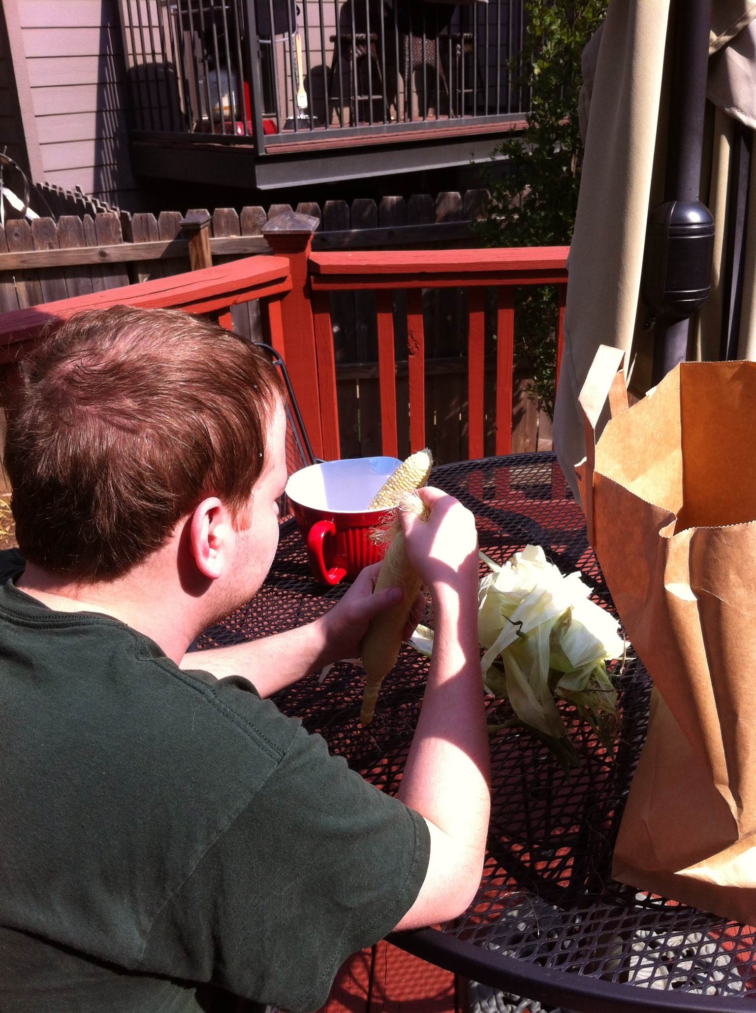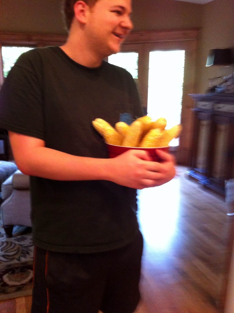 Well, hello! We had a wonderful Labor Day weekend and first week of September. Two of our children came home for the holiday, our Kansas City favorites came down and there was a football game in town! The town was hopping, the weather was pretty good and the Razorbacks won. That, my friends, describes a great weekend. BUT, if you order now, you can also get a party. Okay, shipping is free too. No really, we had a party. We invited our neighbors, the family, a couple of new friends and several “older” friends. Two of the group were classmates of mine back in the day at college. The menu was fabulous. I can say that because I did not do much of it. My brother, James, brought his grill and commenced cooking 12 pork tenderloins! You have not eaten until you have had his tenderloin. It has been a favorite for years. One sister brought yummy guacamole and cookies, one sister brought a corn and pecan dip and then cooked deconstructed street corn. Between the three of them, we ate like royalty. I threw together some heirloom tomatoes, mozzarella and balsamic vinegar. I think we also had green beans, baked beans and some smoked salmon, but I cannot remember the details. Patrick was the corn master! He shucked the corn, washed the corn and took it off the cob. I actually caught a picture of the corn guy!