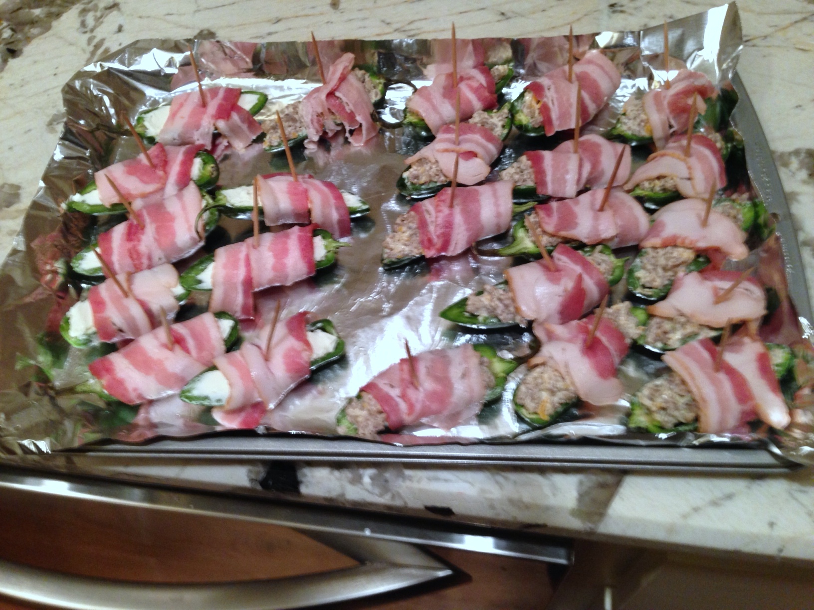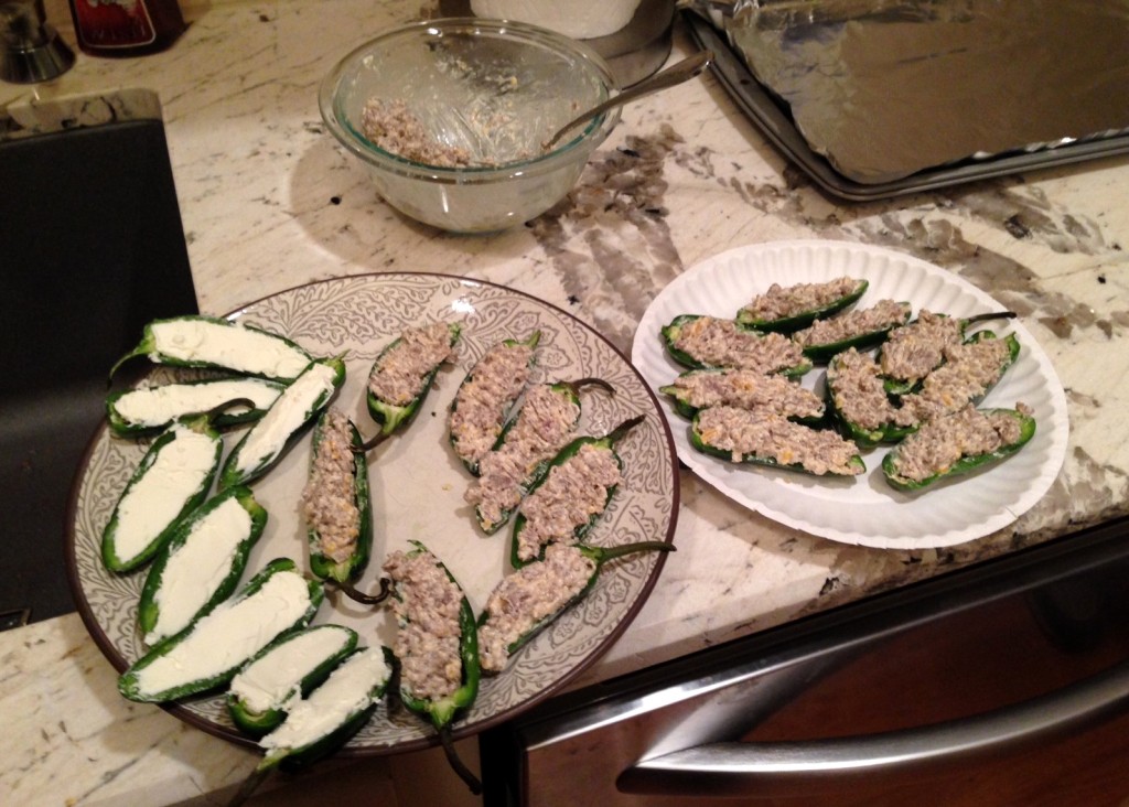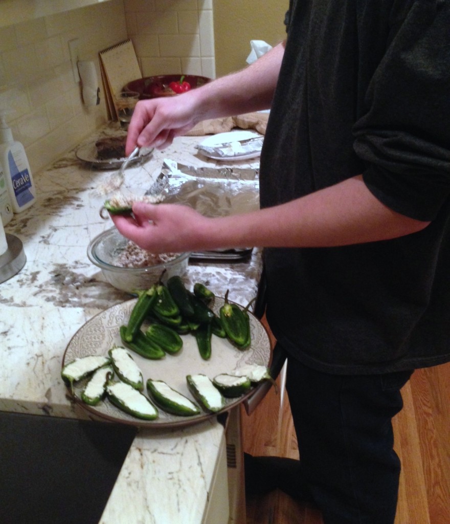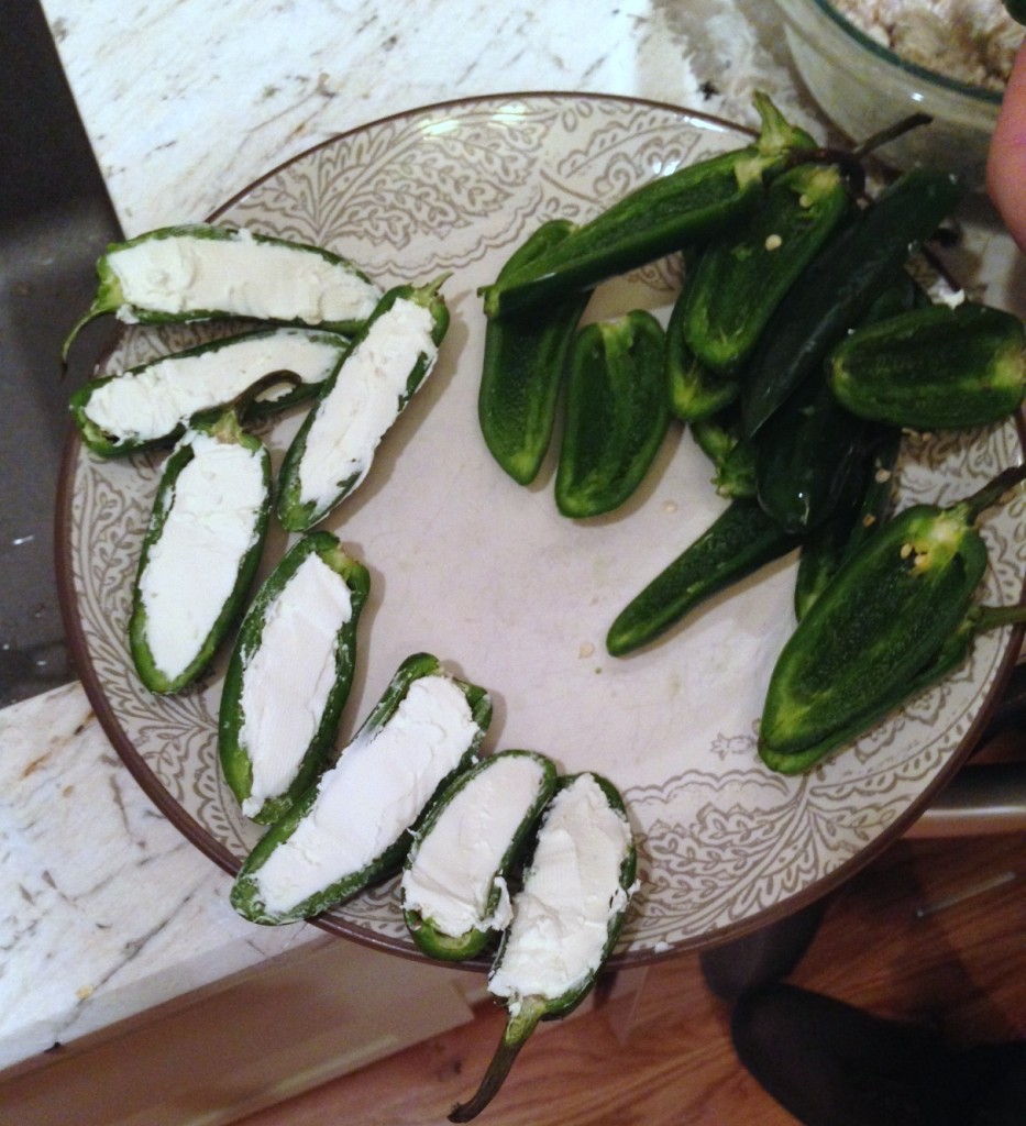 One of the many skills that my dad taught my children was how to shop for groceries and then cook them up. My son, James, is spending some time with us right now. Last night he decided to make jalepeno poppers to savor during the Thunder game. Let me tell you, these were delicious! He did not use a recipe per se, just kind of winged it. He made two different fillings, one cream cheese and one cream cheese with sausage. I have to tell you, they were delicious and it warmed my heart that he made these for our dinner! Here are the pictures: