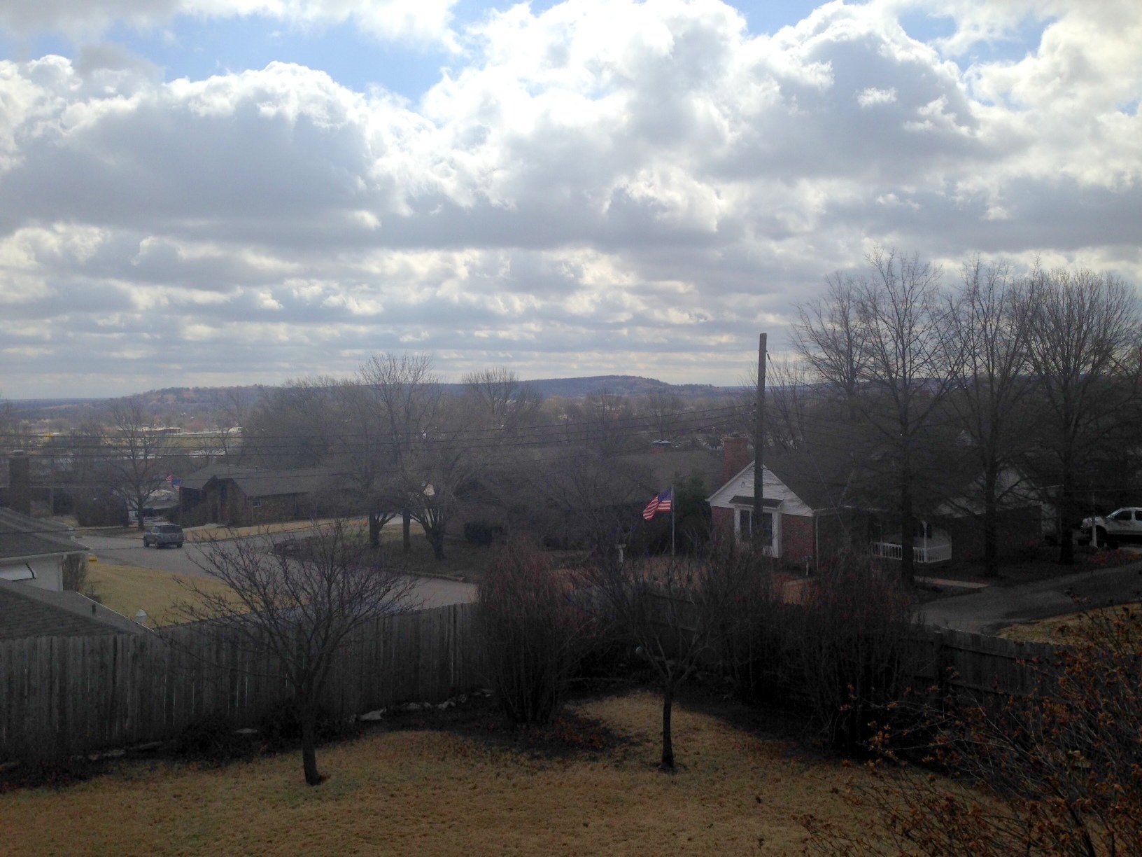 We took the back road over Bird Creek in order for Liz to tell the “green eyes” legendary tale once more. All told, our first foray down memory lane was great. We ended the day with an overnight visit with Mj’s friend Cathy. She is just about the most accomadating host that I know. We talked, we ate, we talked some more and then grabbed some sleep. Her home is so welcoming and her art collection is beyond compare. I do think the visit with her was the highlight of the trip, even though we stayed awake until 2 am. While we were there, the wind was blowing like crazy and the weather was a bit weird. I did manage to grab one picture from her back porch of the Osage hills.