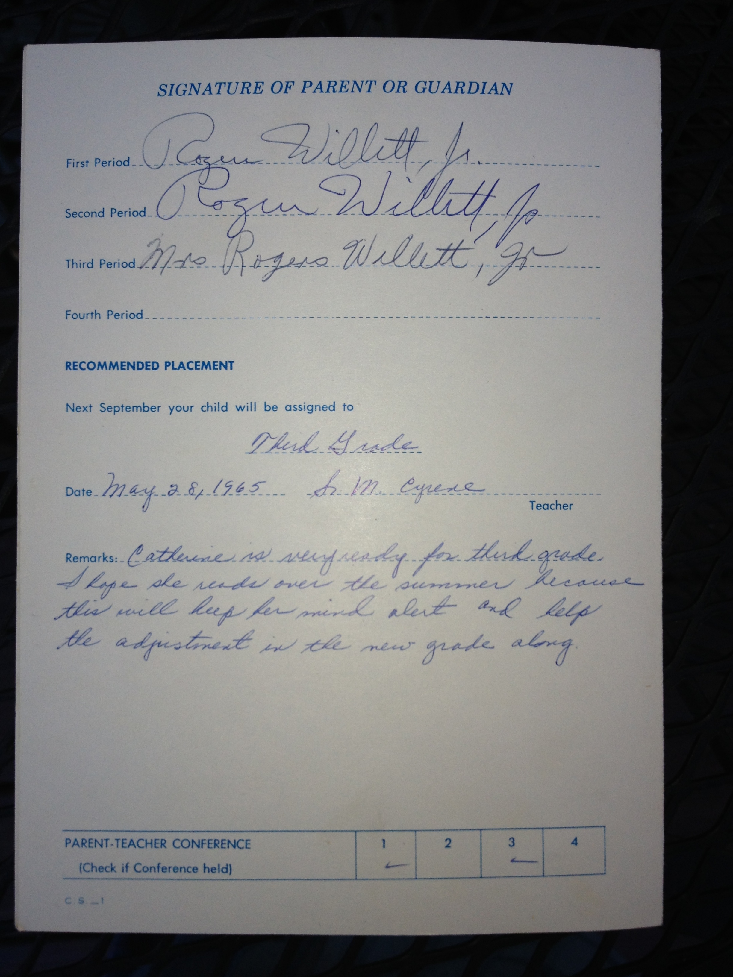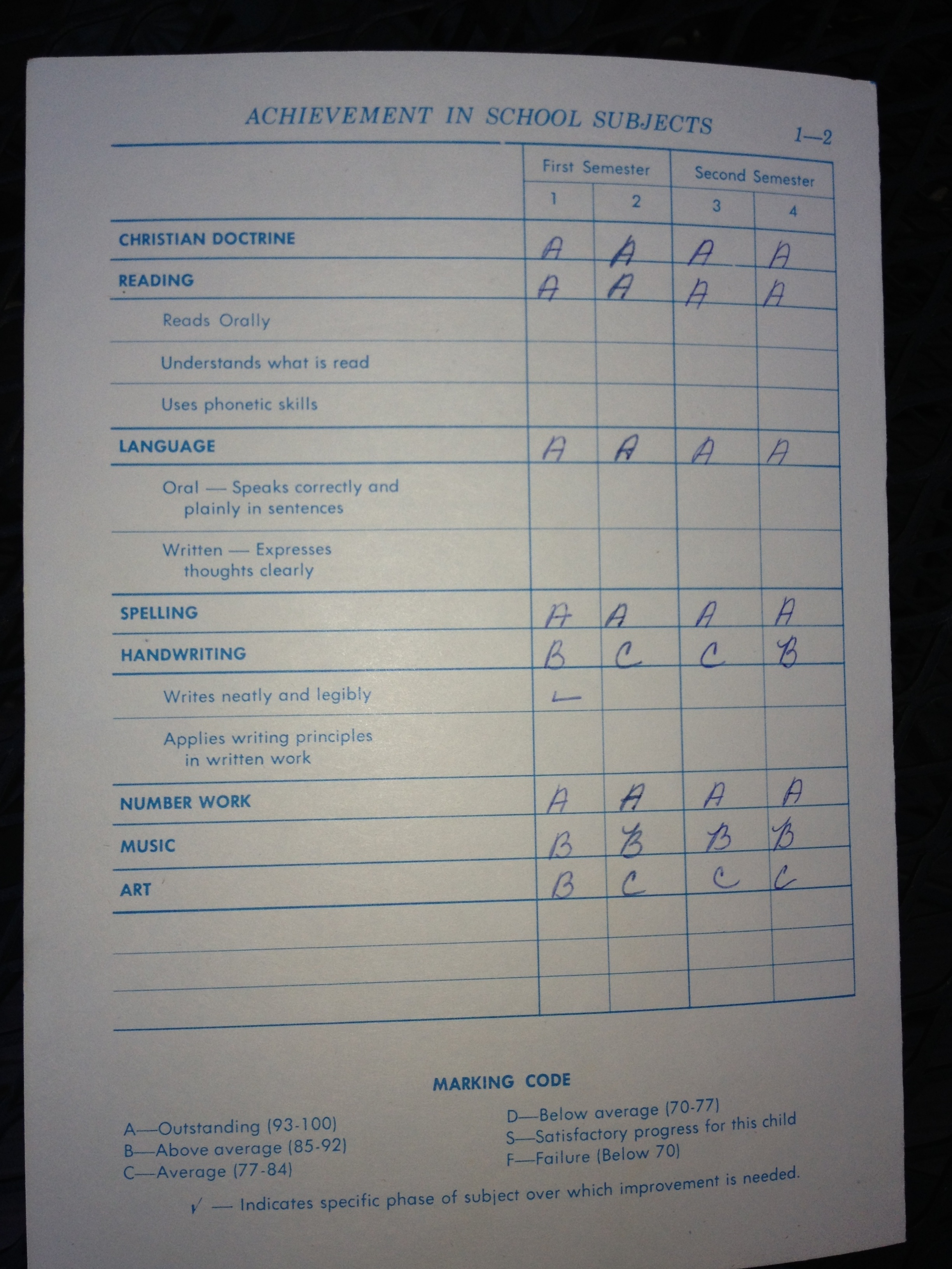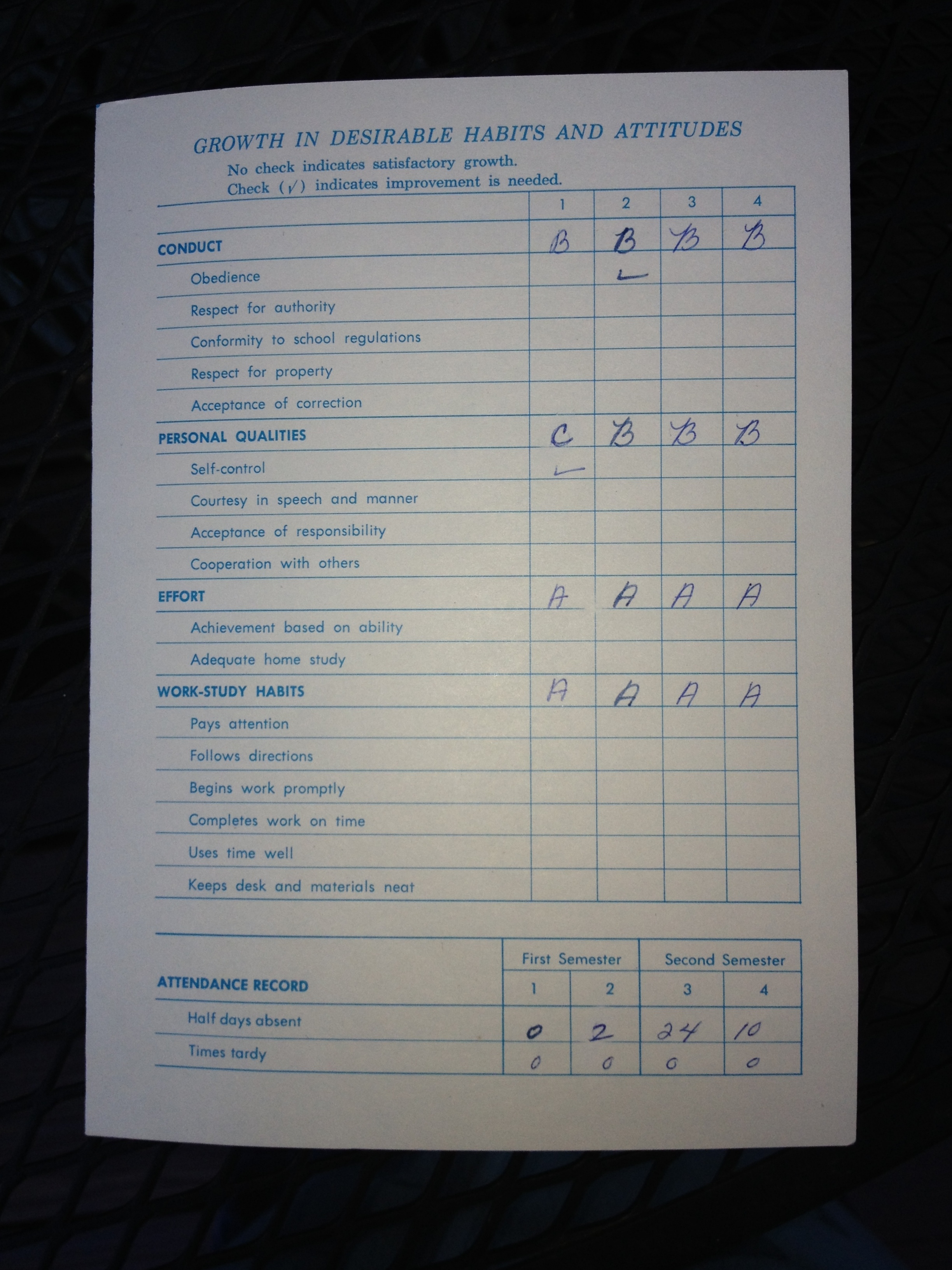Two pots of coffee and three trips to the liquor cabinet and I am ready to try this again. One of the first things I found was my second grade report card. How bad could it be? Well let’s just take a look, shall we? Oh, I might add that this would be the year BEFORE I got kicked out of the school.