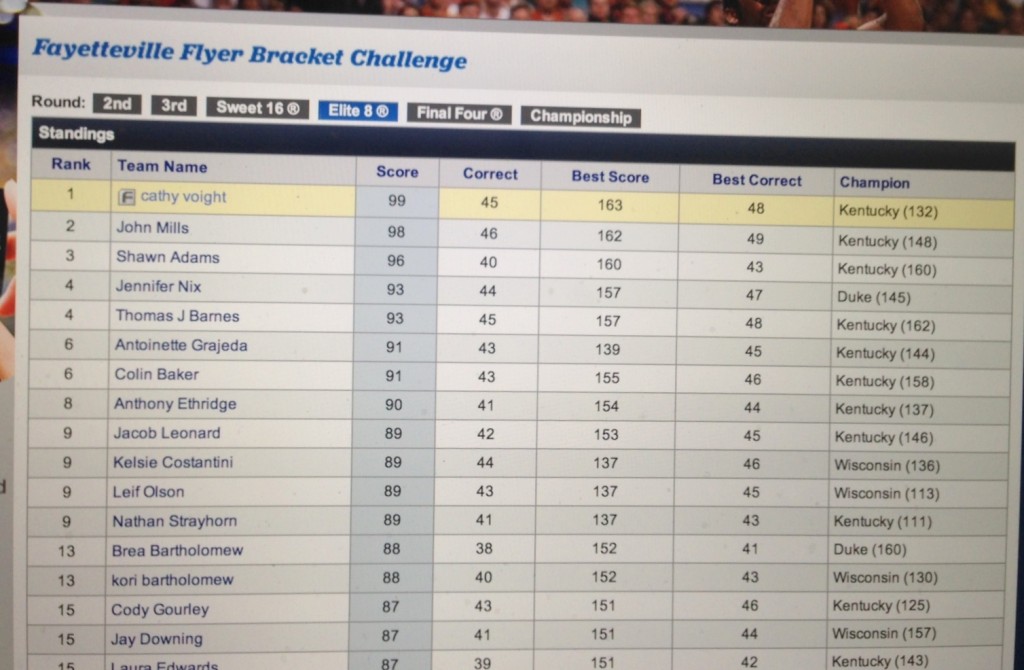 But wait, there is more! I have done March Madness brackets for years and have never, ever even gotten close. Until last night, I was 1st out of 130 people in my bracket. After Kentucky lost, I fell to #4. Randy laughed at my bracket originally, but sometimes things just work out.