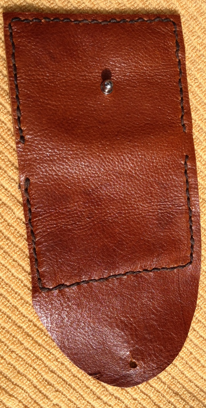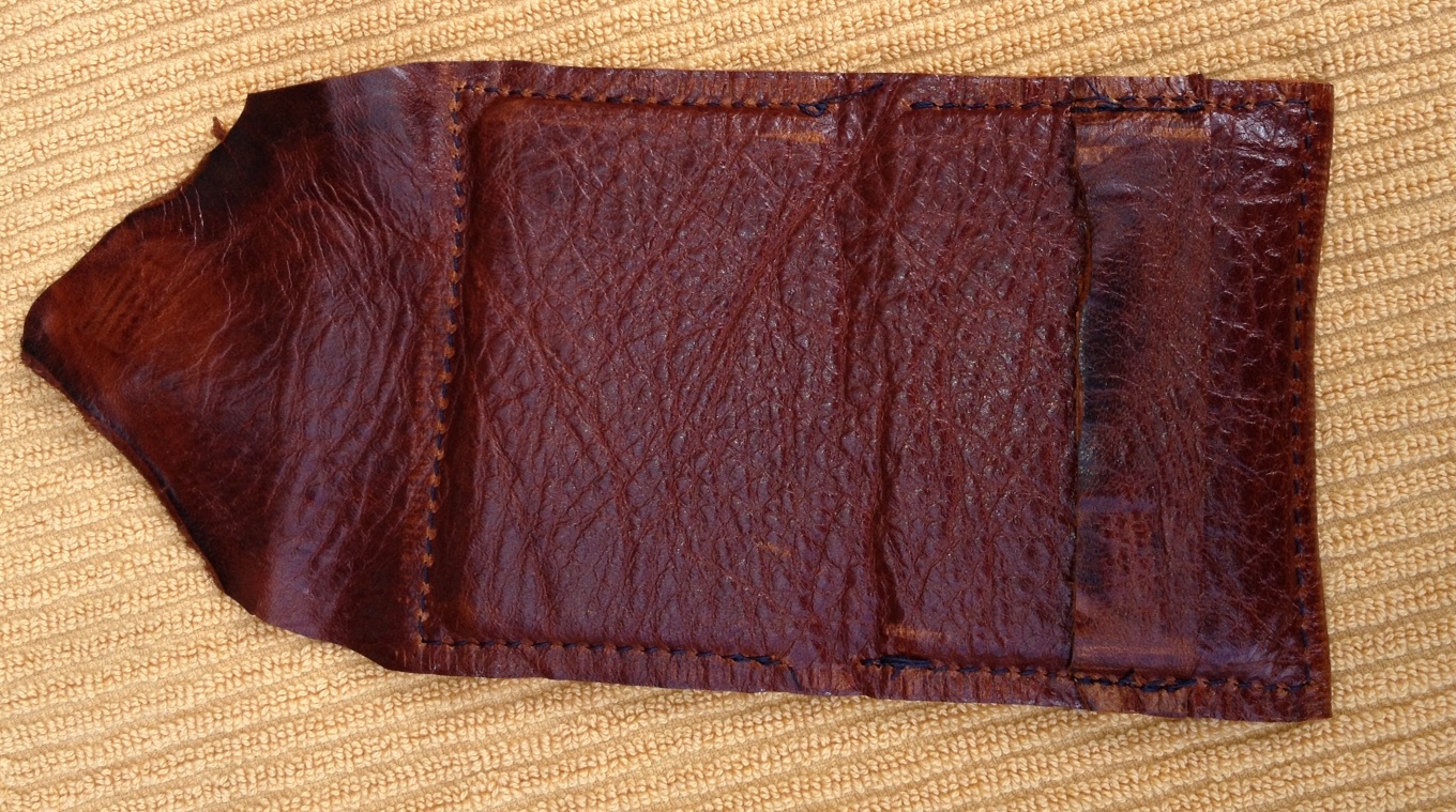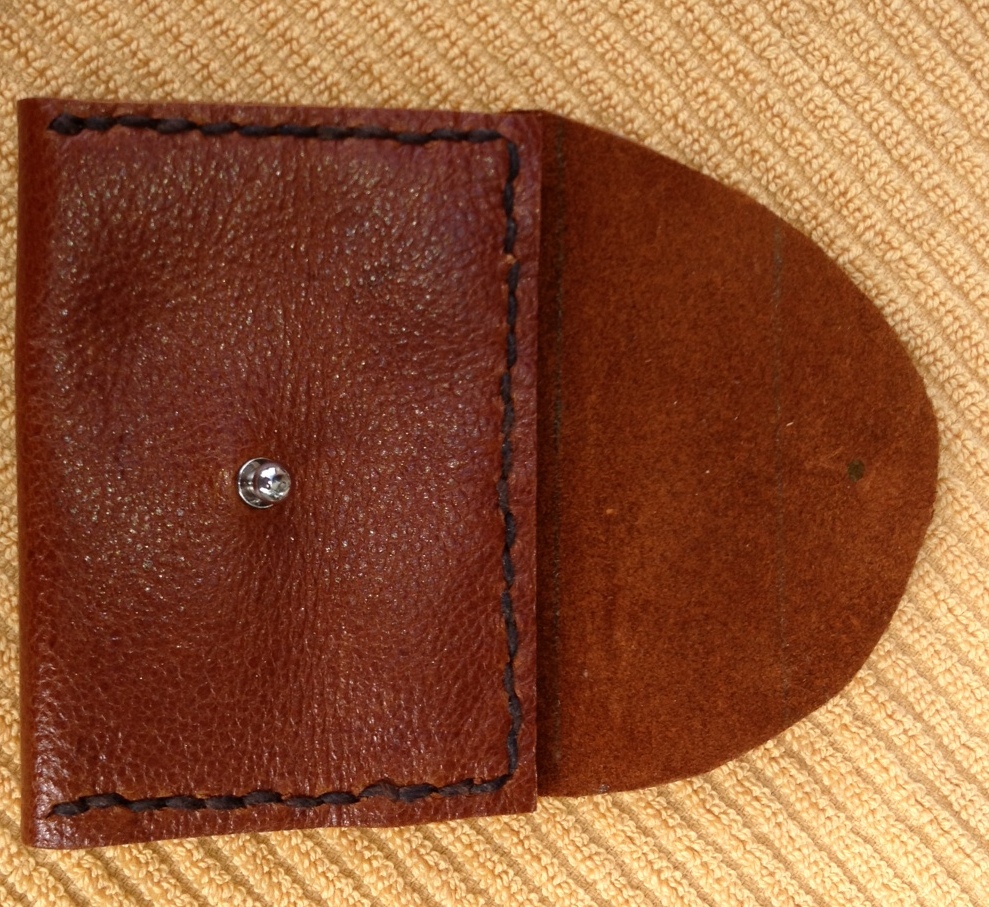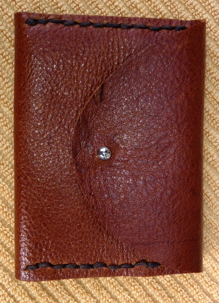 Wallet one is a hand stitched, two pocket version.  On this gorgeous (I jest) boy, I used a button stud closure.  My son Patrick took this one, as it was a “learner” wallet.
