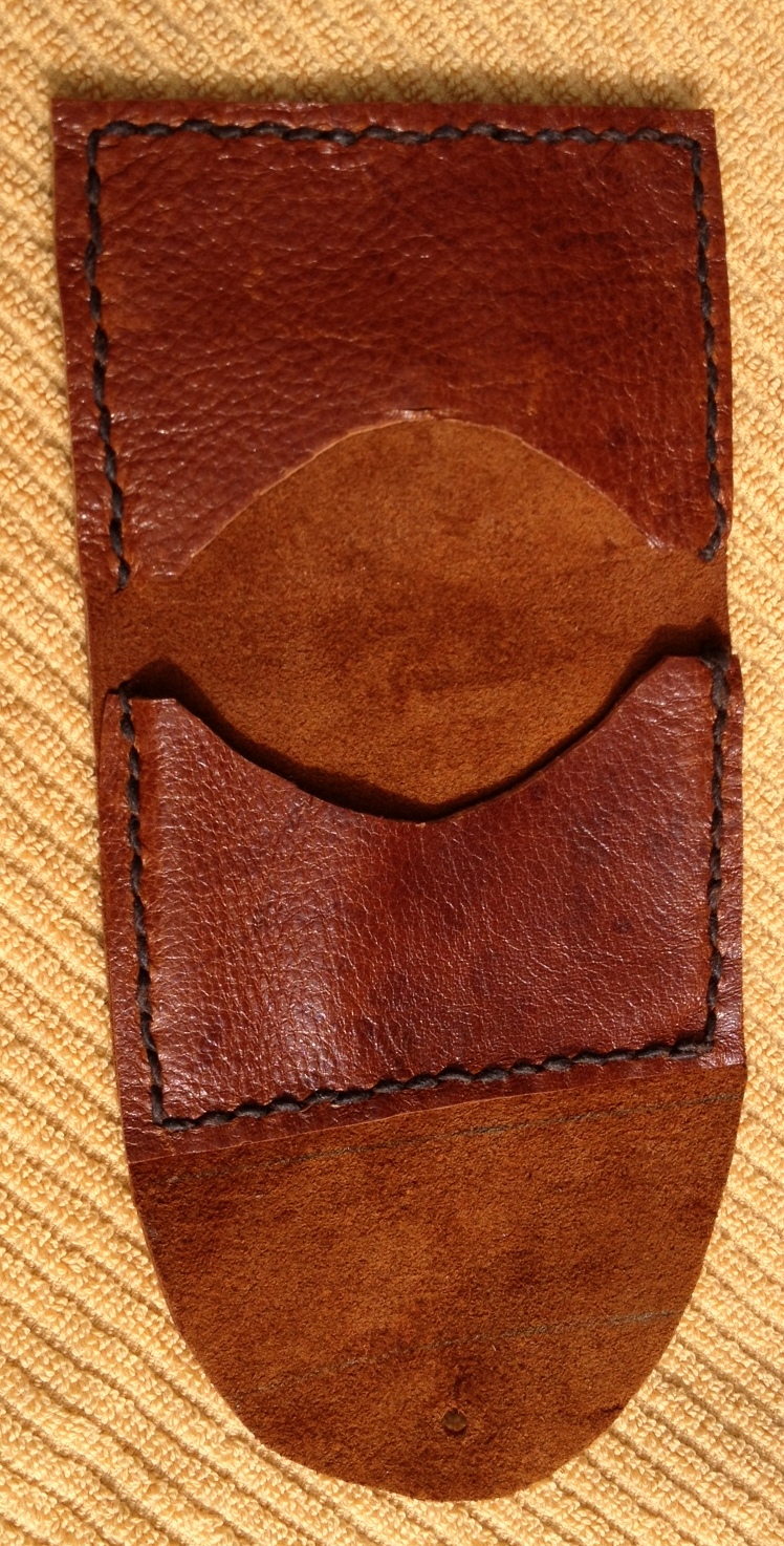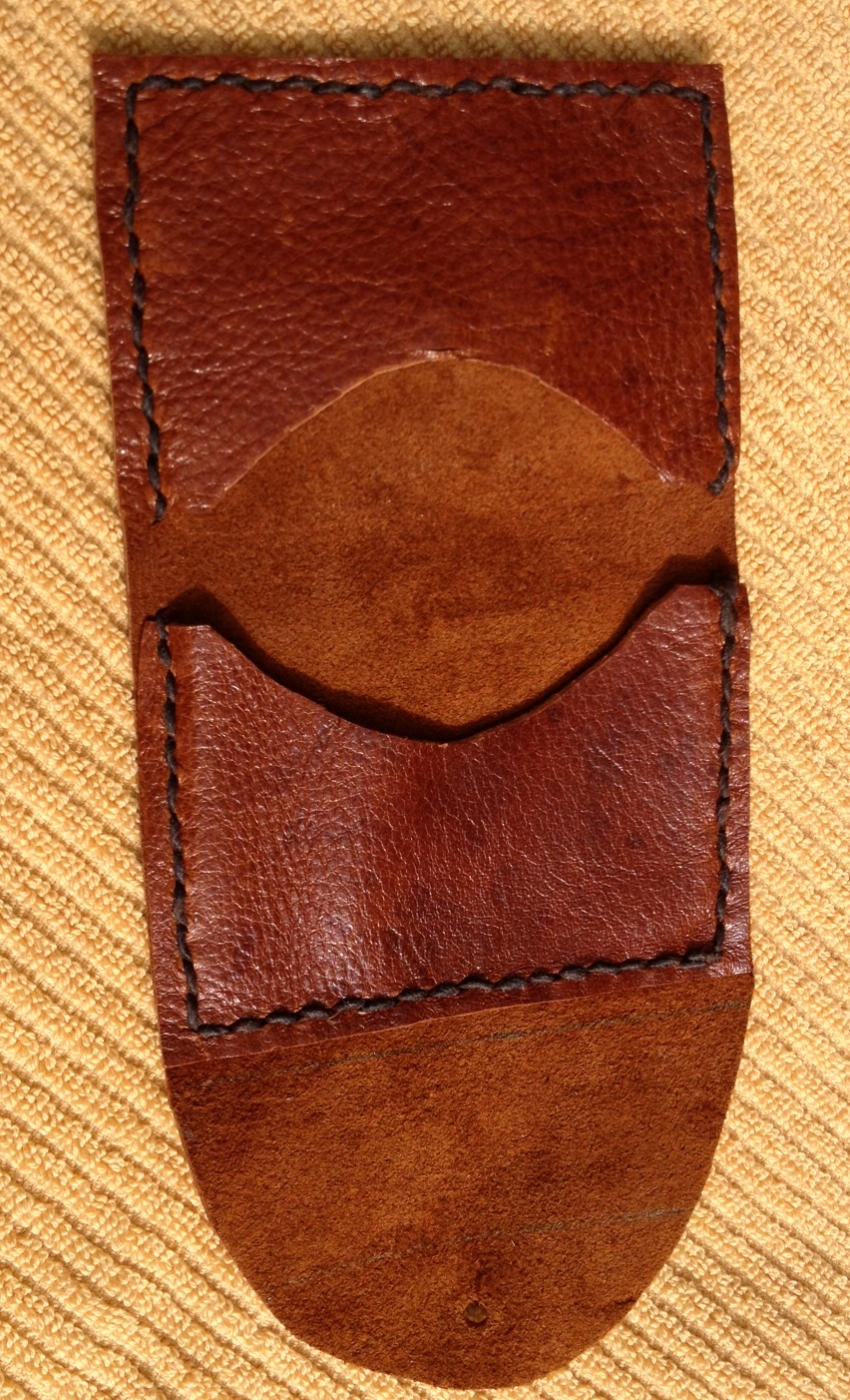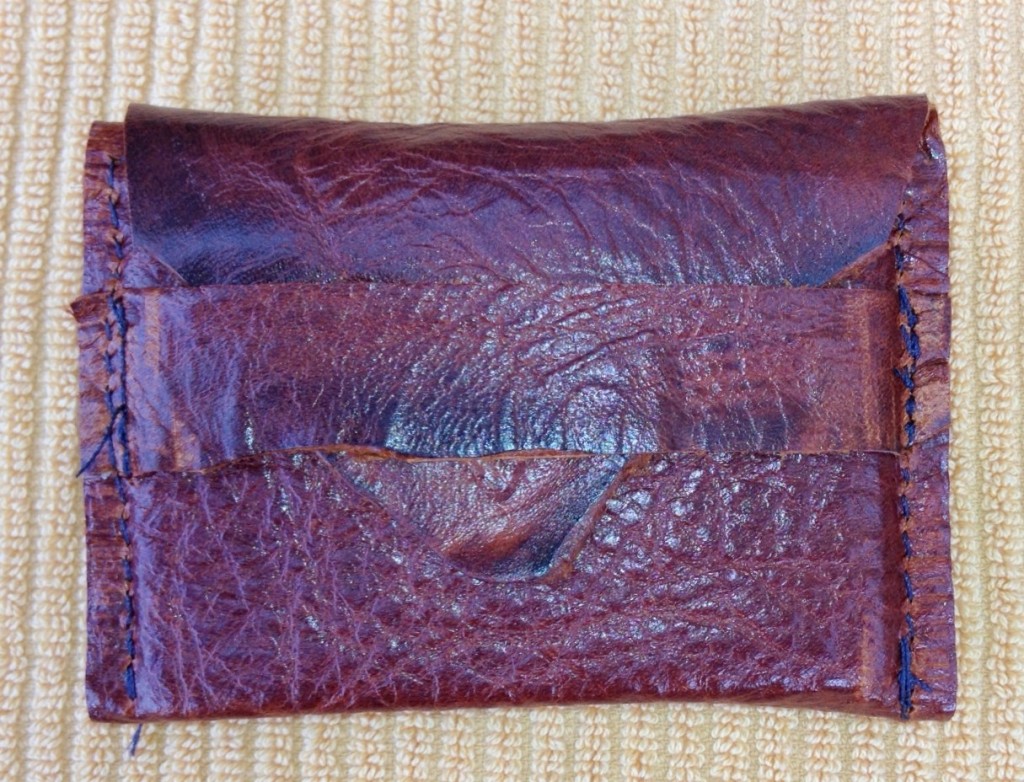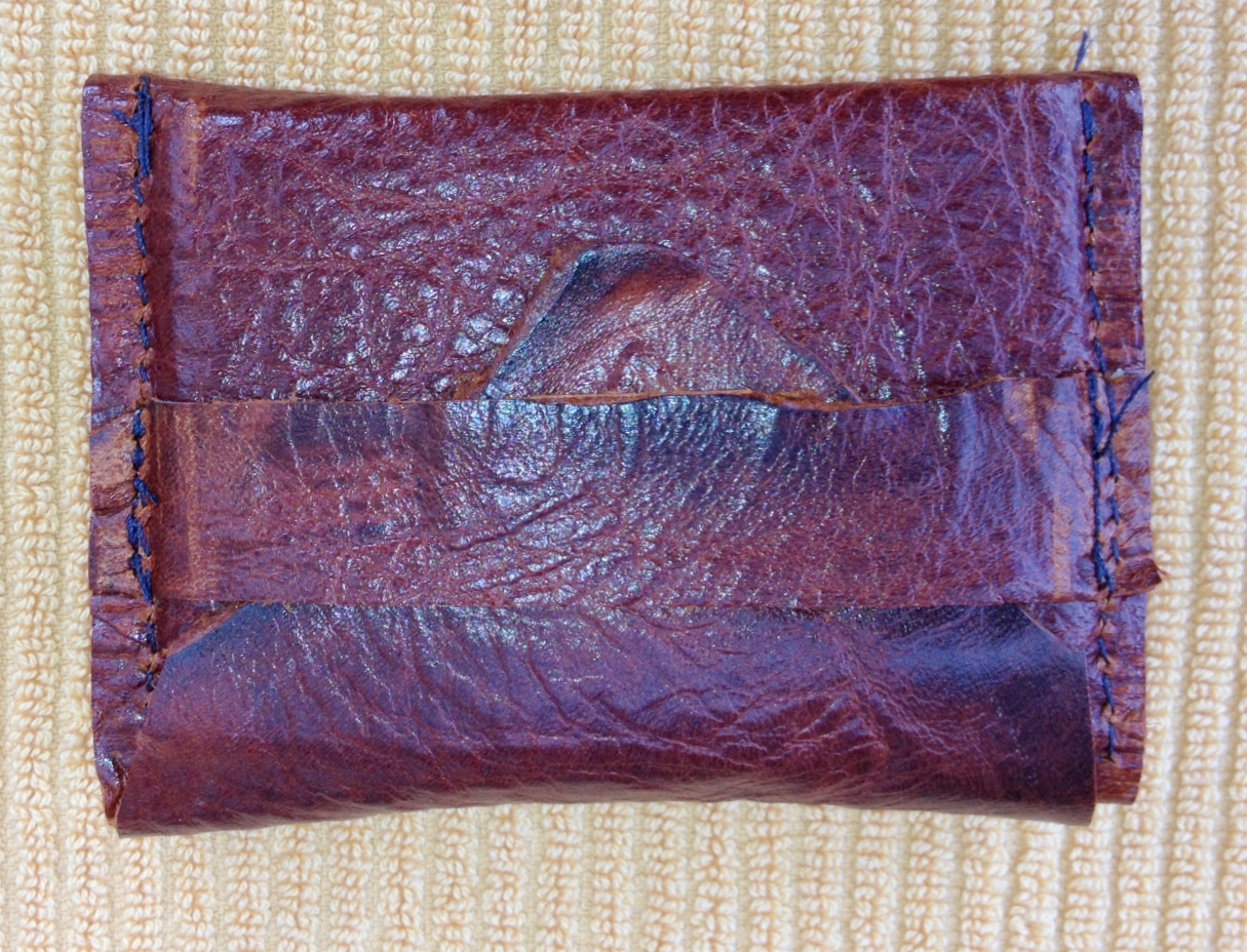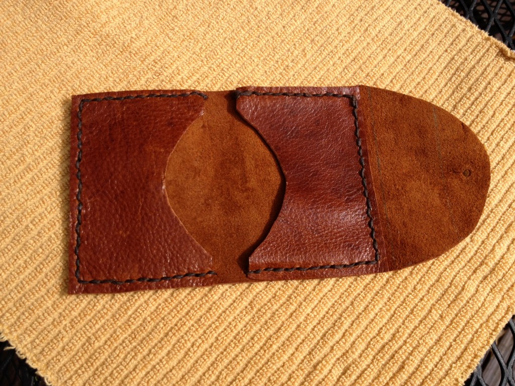 The second wallet is a machine stitched two pocket with a strap to hold it closed.  It too is a “learner” wallet.  I have SO much too learn!  These pictures are darker then the actual wallet.